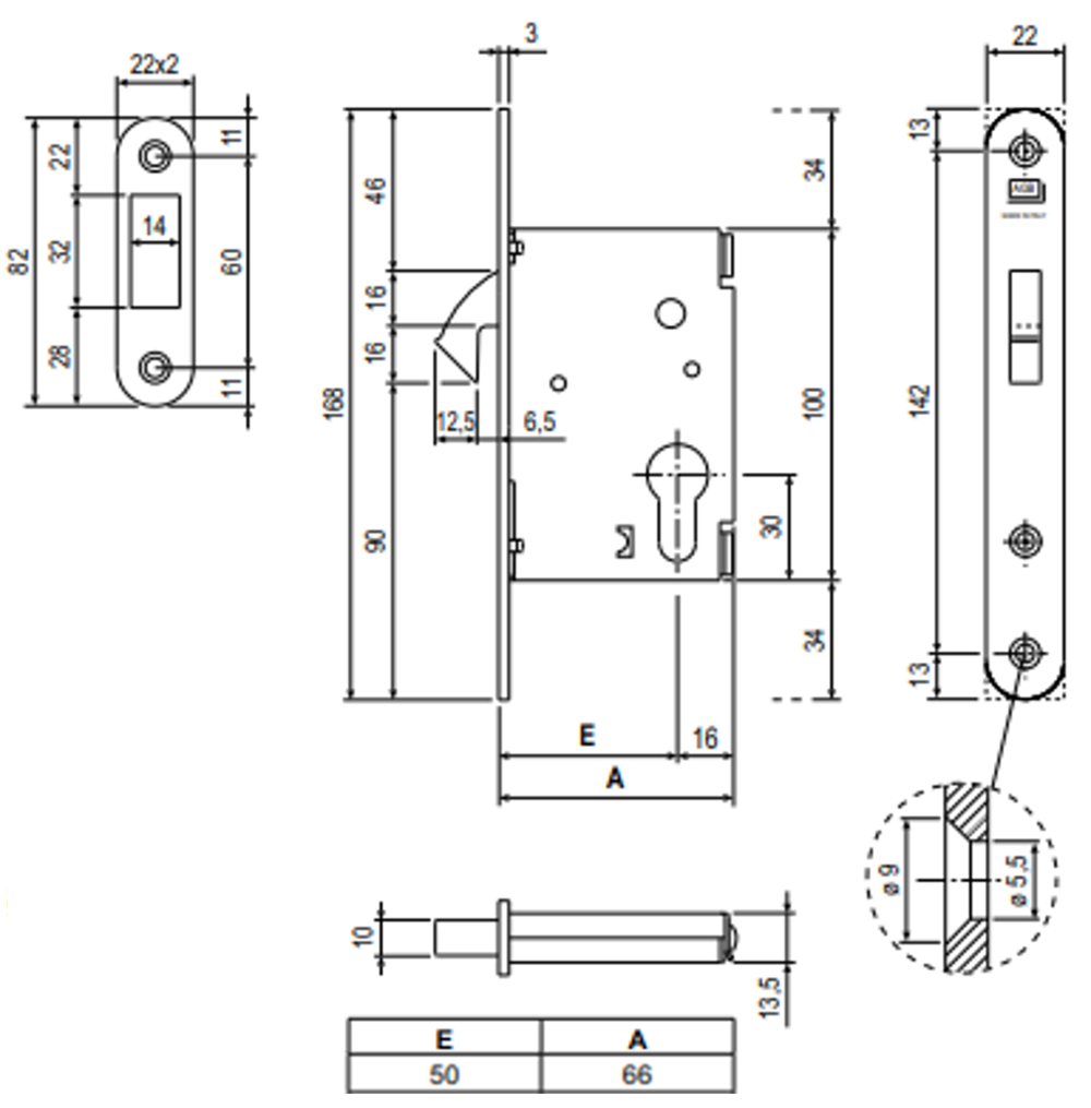 MEDIDAS: Entrada 50mm. / Profundidad 65mm. / Largo Total 169mm.