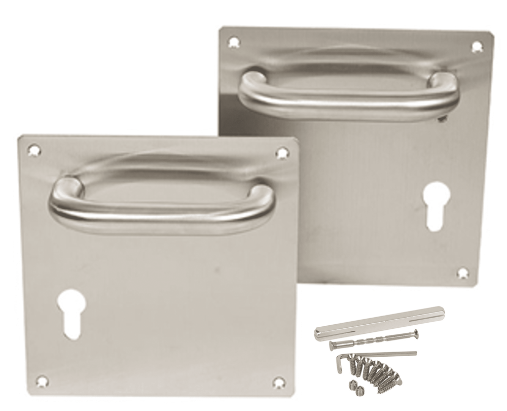 PAR PLACAS 15 X 15 CON MANILLA 810 INOX 304 Y PERFORACION LLAVE SEGURIDAD