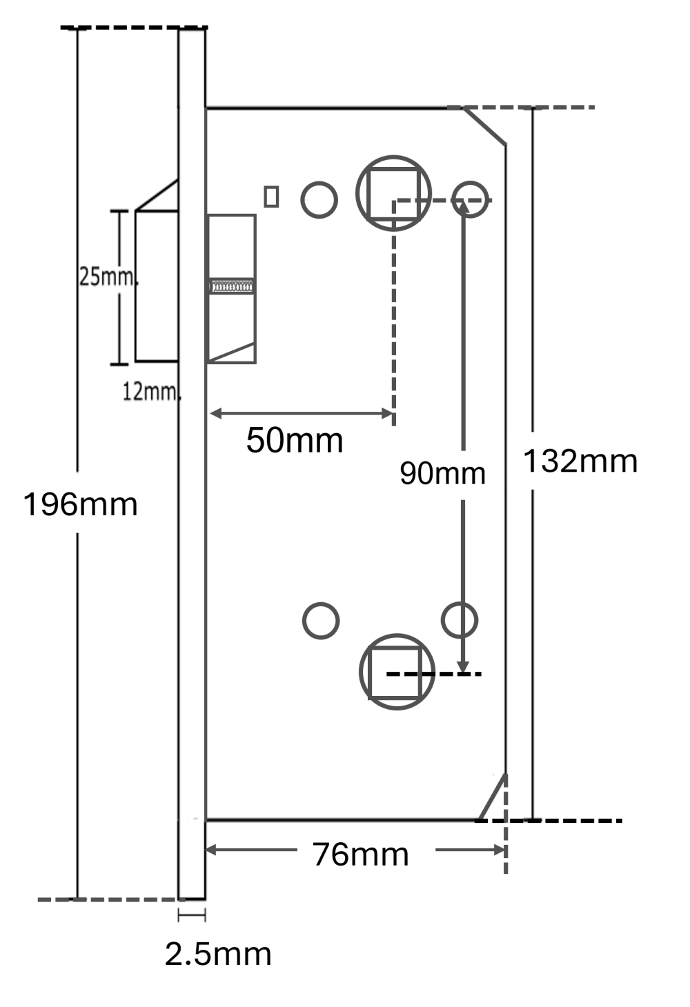 MEDIDAS: Entrada 50mm. / Profundidad 76mm. / Largo Total 196mm. / Frente 25mm.