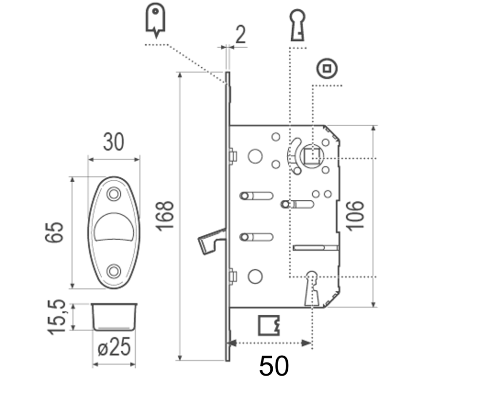 MEDIDAS: Entrada 50mm. / Profundidad 70mm. / Largo Total 195mm. / Frente 18mm.